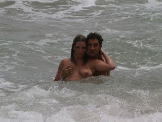 Pornostar young blonde with big boobs Calia B doing a strip by the sea